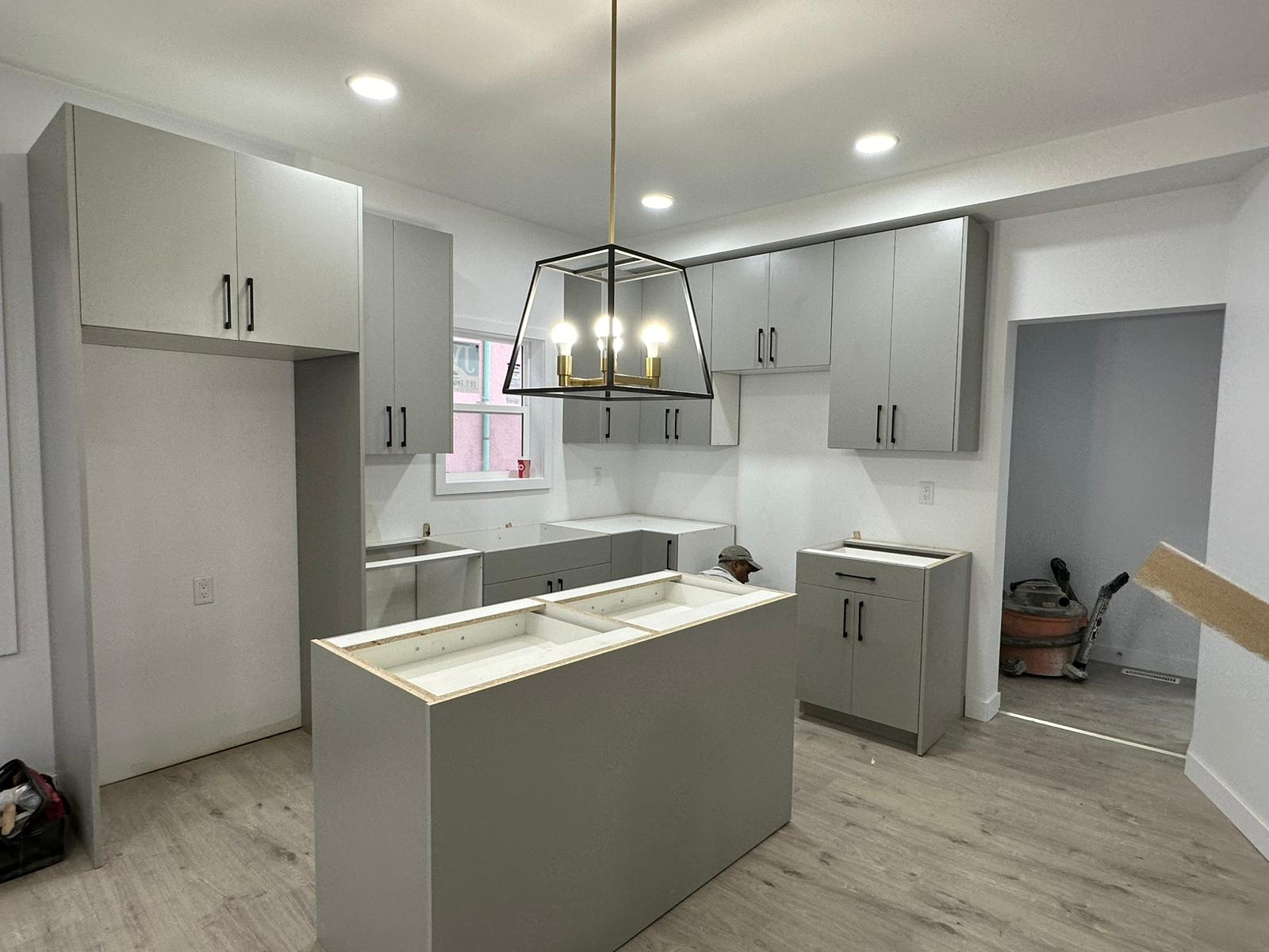 Scope: Design consultation, demolition, layout adjustments, electrical upgrades, plumbing upgrades, flooring installation, cabinetry and finishing work